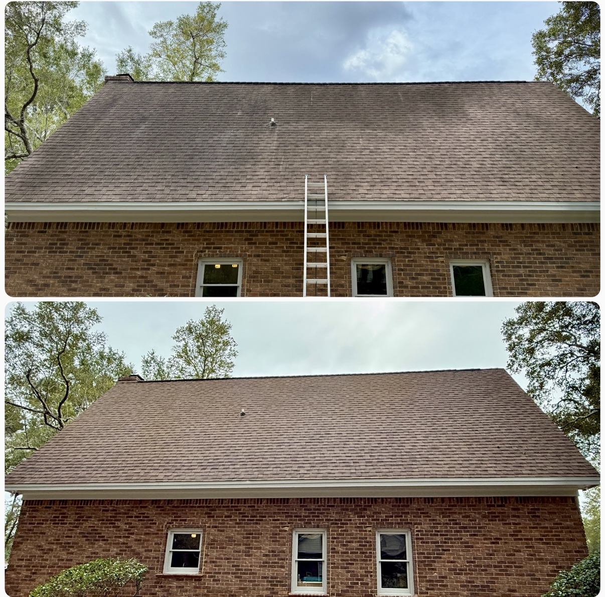 Our low-pressure soft washing process safely eliminates algae, mold, mildew, and lichen without damaging shingles. Unlike high-pressure washing, our method uses specialized cleaning solutions that kill the algae at the root, providing a longer-lasting clean and protecting the integrity of the roof.